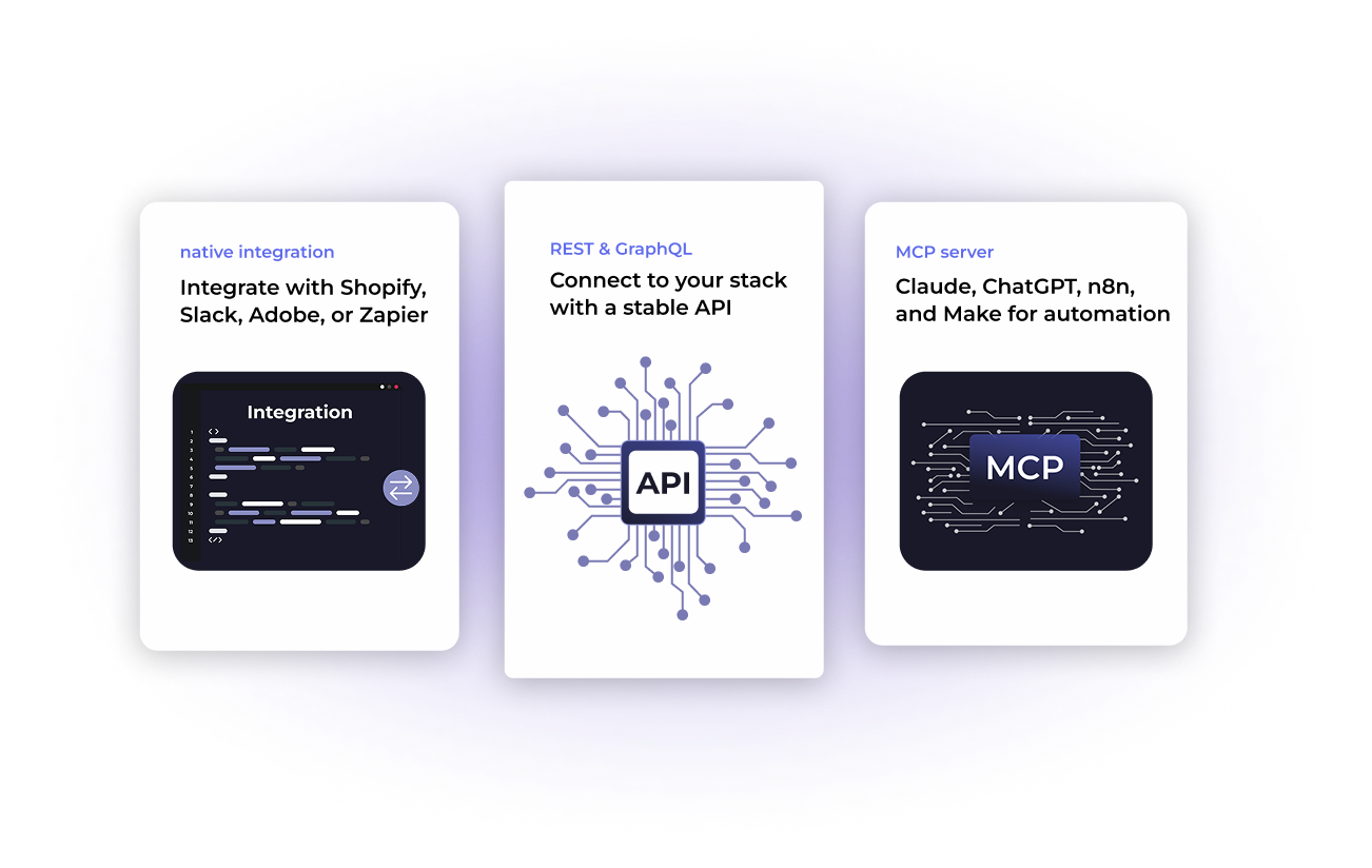 Connect Approval Studio to tools your team already uses with built-in integrations or REST and GraphQL API. Connect to Claude, ChatGPT, n8n, or Make with a native MCP server.